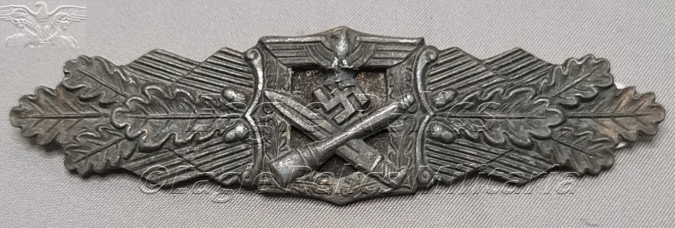 This Six Dot Close Combat Clasp in Bronze is a good affordable example of an uncommon clasp. Made of zinc, and unmarked, which is standard for these. The finish has faded to the base metal of zinc, with a small amount of finish remains on top and right hand leafs at the front, There is a “ding” under the feet and just touching the hakenkreuz, I believe this has been struck rather than an attempt of de-Nazifying the clasp. The reverse has the Bronze coloured pin at the rear. This clasp appears to have been worn, and retains crisp detail. The backing plate is original, and appears to have some initials scratched into it. The maker of this clasp is unknown; and is referred to by collectors as a “six dot” because of the six punch marks used to affix the backing plate on the reverse. The back of this clasp is fairly clean, with the original “six dot” crimps still holding the original backing plate. The brass hardware retains the original finish, The banjo pin and block hinge are still functional; the sheet metal catch appears to have been flattened a bit, and it still works as intended. This Six Dot Close Combat Clasp in Bronze has a great look, and is in excellent condition. The Close Combat Clasp was awarded in Bronze, for 15 close combat days