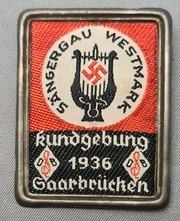 Sängergau Westmark Kundgebung 1936 Saarbrücken Metal Tinnie covered with cloth in clear vibrant colours. Sängergau Westmark was a regional choral association Pin fixing to the rear Clear makers mark