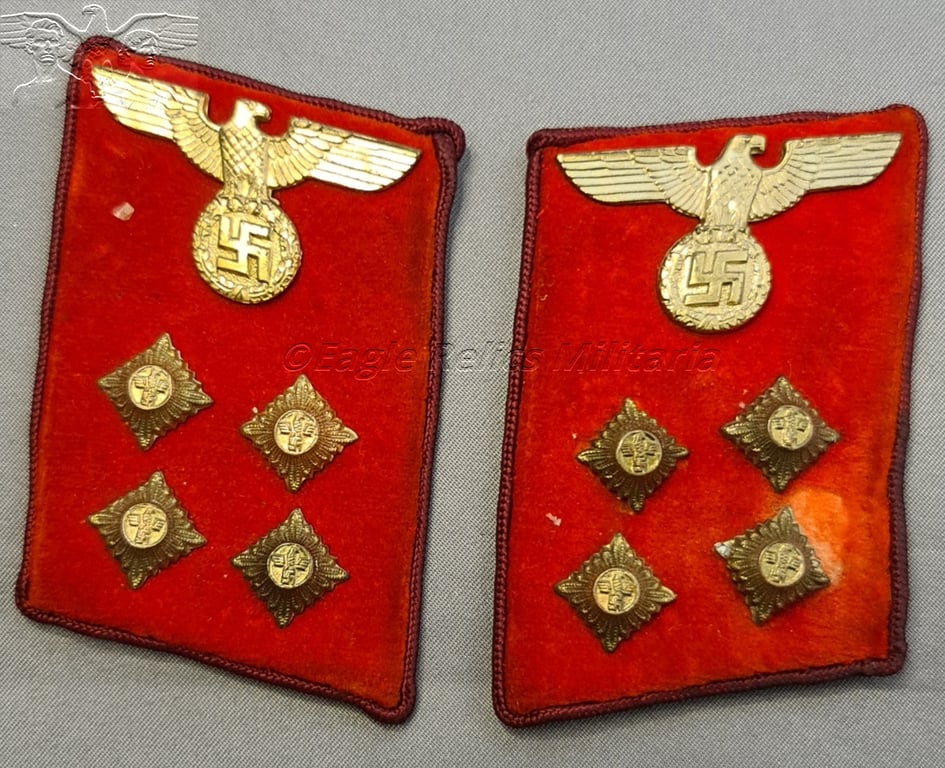 A fantastic opportunity to add a rare set of matched pair “Gauleitung” Head Zone Leader collar tabs. Tabs are constructed on a red velvet base, with dark red rayon piping. The reverse has the correct style buckram, and has some of the RZM label to one and the remains of a label to the other The collar tabs feature a gilt national eagle clutching a wreathed, static swastika in its talons, as worn between 1939-45. Beneath the eagle are four gilt washed alloy political rank pips. This combination of pips indicates a “GemeinschaftsLeiter” - Community Leader rank - at the Gauleitung “Gau” level.