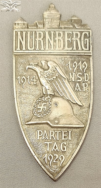 Elusive and 100% original 1929 rally table medal in silver grade. Elusive may actually be an understatement for this is a piece you never see. it’s hard enough finding a real bronze. The medal sports the hallmarks of every "correct" version, including the off-level castle, the very fine feather details on the eagle’s chest, and the diagonal patterns on the eagle’s long wing feathers. The medal lacks its original fitted case. I have taken detailed photos of the award, paying particular attention to the “shear marks” on the sides. This proves that it NOT a cast reproduction, but is in fact an original award that is nigh on impossible to find on the market. The correct manufacturer's mark, "Hoffstätter Bonn", on the reverse. It does not have a case – hence the price This special honour badge, through regulations of 6 November 1936, established the badge for the 4th Reichsparteitag der NSDAP in Nuremberg of 1-4 August 1929. This award was a larger, non-wearable version of the Nuremberg Party Day Badge and was produced in bronze, silver, and gold grades. It featured the same design as the wearable badge: Often presented in a fitted case *The non-portable plaque was awarded for high achievement in organizing the rally, while the smaller, portable badge was given to all NSDAP members who attended the event.