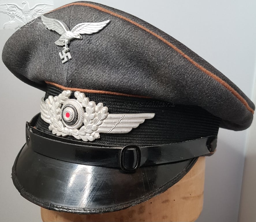 This is a very nice early Signals Luftwaffe Visor cap. A good "saddle form" shape - standard issued cap with good strong colour and the preferred green underside on the peak. The lining is complete and sized at 55. Although the Celluloid diamond is missing it displays a faint makers mark and a date of 1939. The sweatband is the early leather type, and shows one repair which I believe is period. There are a few repairs to the cap top. again I believe period, (see photos) This is priced to sell. A good all round cap that has been worn and loved