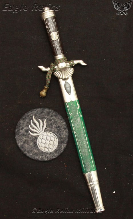 This is a 3/4 size replica of a National Hunting Cutlass with very fine, high quality detailing throughout. It is constructed of metal cleverly designed to simulate the antler grip and leather scabbard. The pommel is an exact replica of the full size version, with a fine, round screw which acts to retain the tang. The pommel is umbrella-like, with dual lines on the sides. The ferrule duplicates this look. This little dagger even has a period green/silver mini portepee which is tied around the grip and crossguard. The crossguards are in the shape of deer legs, with simulated hair and fine hooves. Below the guard is a nice clamshell. The metal grip closely simulates a stage grip, painted a dark brown. In the centre of the grip is a very good looking National Hunting (DJ) insignia. The scabbard has beautiful nickel mounts with scalloped edges. The upper mount has a perfectly simulated acorn lug, and the lower mount is scribed with twin decorative lines. The “leather” portion of the scabbard is simulated with a green “crackle” finish and has the standard dual trim lines at the edges. The blade of this miniature measures just under 6 inches long, double etched with hunting scenes. These etchings are extremely crisp throughout. The obverse depicts a pair of stag in a forest glen while the reverse has a dog tracking what appears to be a wolf. The ricasso is etched with Hörster “H” trademark, and the original green felt buffer is in place.. Super little miniature.