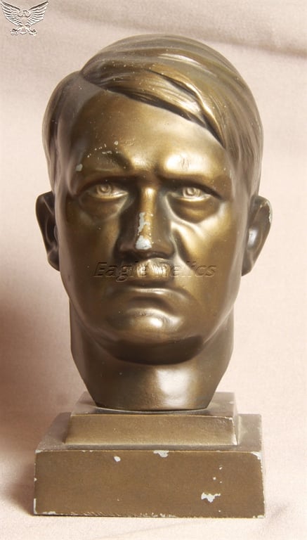 Beautiful looking Adolf Hitler bust quarter size by H.H. VAN BEUSEKOM from Gladbeck – HB- which is nicely marked on the base. The bust does display a few knocks and loss of finish, but you would expect to see this on a 90 year old object Schmidt-Hopfer was the artist who was well known for designing all HB Hitler busts This is a pre-war example made from Spelter an alloy of zinc and lead. Spelter is also used to describe a copper-zinc alloy, with a Bronze coating. Bronze was scarce during the war and could only serve for military purposes, The maker mark ‘HB’ is visible on the back. It is original mounted on a base from about 7.5 x 7.5 x 3cm. The head itself measure a height of 13cm and width of 7cm. Total height with marble base 15,5cm. A very nice piece of Third Reich artwork