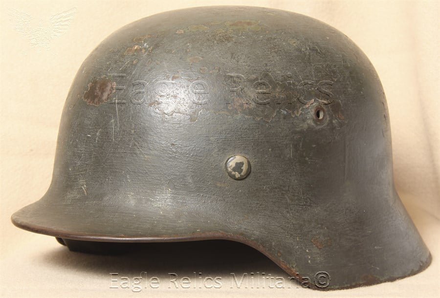 This is a fantastic opportunity to own a character helmet straight out of the woodwork – It’s only ever been in one collection It is not one of those helmets that has been pushed around from pillar to post. A former “Apple Green” Double decal Army issued combat helmet that has been heavily brush painted over in a dark green colour. Neither decal was removed, as the paint – over time – has cracked to reveal red and white cracks on the tri colour, and a small amount of silver content showing through the painted shell . The helmet has the early aluminium liner with all rivets being tight to the shell, and plenty of dust and grim in-between the liner & shell. The side is stamped SE 64 for Sächsische emailler und stanzwerke A.G. / Lauter, and a Lot number of 3961. The interior shows storage features and the leather is supple being a size 57. There is some writing to the inside of the liner – but I can’t make out what it says as it is where the head would be, so it has been rubbed. The chinstrap is an early one being