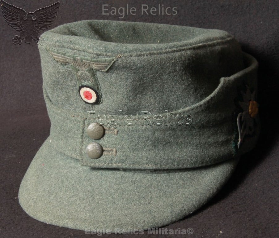 There is very minimal wear to the cap overall, and shows lightly worn material with machine stitched factory application of the insignia. To the left side has been hand sewn an Edelweiss signifying the wearer to be a member of Mountain troops. A nice added bonus is the name tag sewn to the inside. The internal material is twill, indicating an early production – later ones had rayon and were RB numbered It’s a great size at 57.