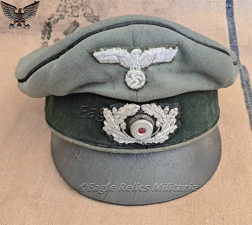 A small nip to the back end of the cap. Early black wool piping runs the perimeter of the caps crown and bands. A hand sewn green backed flatware Eagle is very oxidised and hand sewn to the front . The cockade is the metal type and the wreath is also hand sewn to the green band below the eagle.
