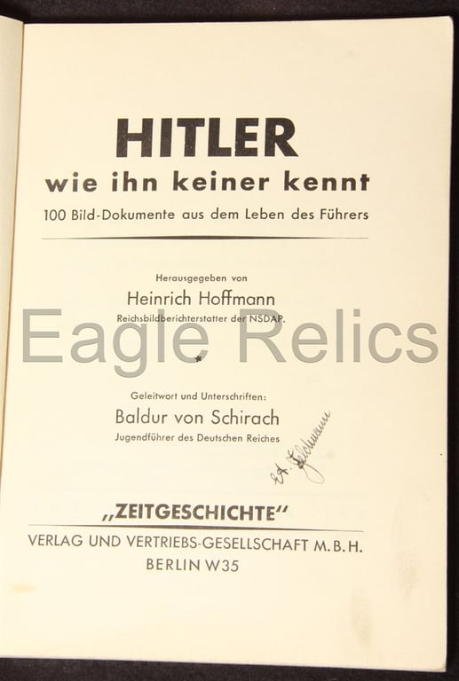 Early edition, 1934 printed, Heinrich Hoffmann's photo book 'Hitler wie ihn keiner kennt'- Hitler Like No-One Knows him Softcover, foxing and staining, dustcover missing A collection of photos by Hitler’s private photographer Heinrich Hoffmann recounting events in Hitler's life. Softcover, 96 pages, along with a foreword written by Hitlerjugend leader Baldur von Schirach. The dust jacket is missing and the covers show some wear and age, but no missing pages. Interesting 1932 dated “Heil Hitler!” inscription written on the first page. The later “deluxe” hardcover versions of this book are fairly expensive, fairly rare example.