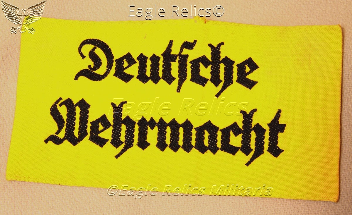 Made of yellow cotton with the words "Deutsche Wehrmacht" embroidered in a Gothic script. Excellent condition The armband was worn by non-uniformed personnel who were serving with the German armed forces. It was introduced with the Army Mobilization Order on March 12, 1937.